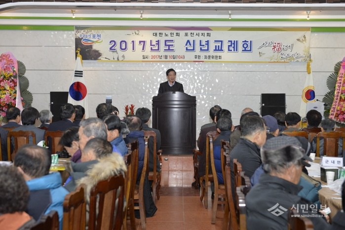 경기 포천시 대한노인회 포천시지회는 지난 10일 용정결혼회관에서 '2017년 신년교례회'를 개회했다. 사진은 행사에 참석한 민천식 포천시장 권한대행이 인사말을 하는 모습.(사진제공=포천시청)