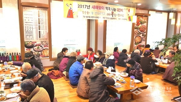 경기 의정부시 의정부2동 주민자치위원회는 지난 10일 주민자치위원인 고미자씨와 함께 지역내 경로당 노인 70여명에게 새해맞이 떡국나눔 대잔치를 개최했다. 사진은 노인들이 식사하는 모습.(사진제공=의정부시청)