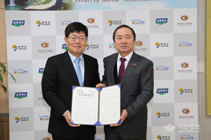 12일 경기 연천군과 롯데주류는 '지역 인재육성 장학기금 조성을 위한 업무협약'을 체결하고 장학금을 전달받았다. 사진은 김규선 군수(오른쪽)와 이재혁 대표(왼쪽)가 협약 체결 후 기념사진 촬영을 하는 모습.(사진제공=연천구청)
