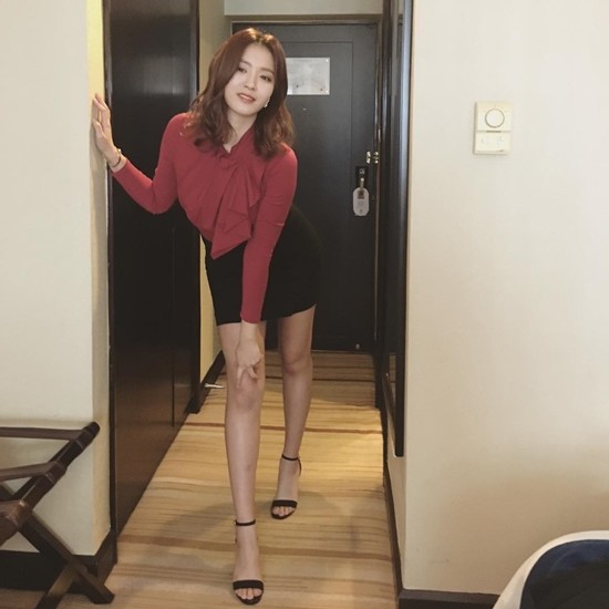그는 사진 속에서 몸에 딱 붙는 레드계열의 블라우스와 블랙 치마를 입고 브이 포즈를 취했다.