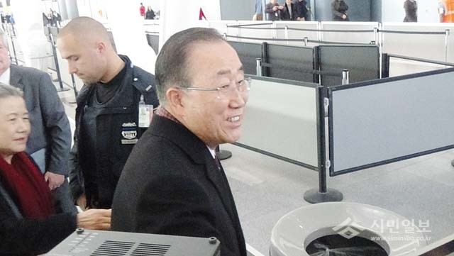 반기문 전 유엔 사무총장이 11일(현지시간) 오후 1시 미국 뉴욕 JFK공항을 출발해 인천국제공항으로 향하는 아시아나항공 비행기를 타고 있다. 반 전 총장은 공항에서 한국 언론과 간단한 인터뷰를 한 뒤 유순택 여사 등과 함께 비행기를 탔다.