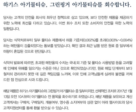 하기스 퓨어 물티슈가 메탄올 허용기준을 초과해 논란을 일으키고 있다.