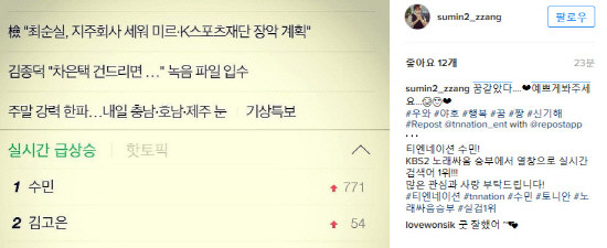 사진은 포털 사이트 실시간 검색어 1위에 수민이 랭크돼 있다. 이에 수민은 팬들에게 감사함을 전하고 있는 모습이다.