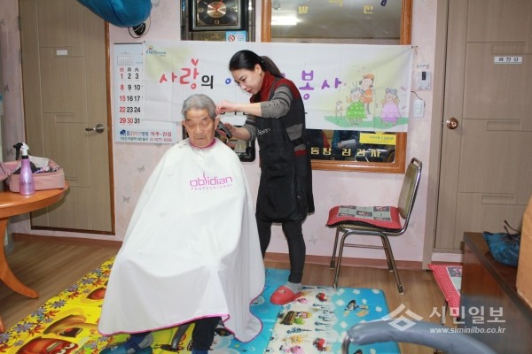 최근 경기 동두천시 생연1동 주민자치위원회에서는 생연1동 지역내 경로당을 방문해 생활형편이 어려운 노인들에게 사랑의 이·미용 봉사를 실시했다. 사진은 미용실을 운영하는 주민자치위원이 노인의 머리를 손질하는 모습.(사진제공=동두천시청)