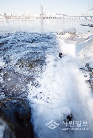 올겨울 최강 한파가 이어지고 있는 15일 오후 서울 잠실대교 인근 한강에 얼음이 얼어있다.