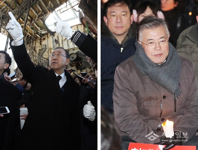 반기문 전 유엔(UN) 사무총장이 15일 경기도 평택시 해군 2함대를 방문해 천안함을 둘러보며 설명을 듣고 있다. 더불어민주당 문재인 전 대표는 14일 오후 서울 광화문광장에서 열린 12차 촛불집회에 참석하고 있다.