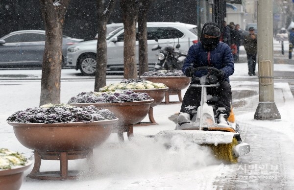 최근 내린 눈으로 인한 주민들의 통행 불편을 예방하기 위해 서울 동대문구청 직원들이 구청 앞 보도 제설작업을 실시했다. 사진은 구청 직원이 제설자동차를 이용해 보도에 쌓인 눈을 치우고 있는 모습.(사진제공=동대문구청)
