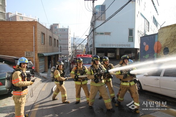 구로소방서는 지난 12일 오후 1시 시흥대로 101길 일대에서 중계송수 및 중계방수 훈련을 실시했다. 사진은 소방서 관계자들이 소방호스로 중계방수 훈련을 진행하는 모습.(사진제공=구로소방서)