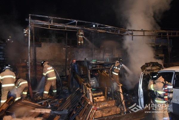 17일 오전 1시18분경 영등포구 문래북로 소재 청소업체 차고지 가건물에서 원인미상의 화재가 발생해 차량1대 및 집기류 등을 태우고, 1800만원의 재산피해가 발생했다. 사진은 영등포소방서 소방관들이 화재를 진압하는 모습.(사진제공=영등포소방서)