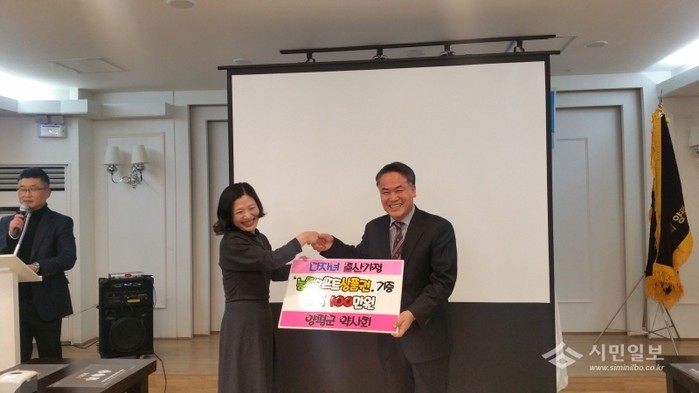 경기 양평군 약사회가 지난 13일 약사회 정기총회에서 지역내 넷째아동 이상 출산가정 양육 지원금으로 100만원 상당의 상품권을 보건소에 전달했다. 사진은 양수은 약사회장과 권영갑 보건소장이 악수하는 모습.(사진제공=양평군청)