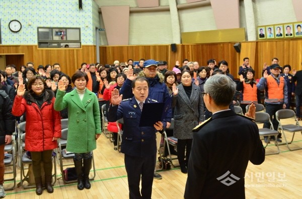 지난 17일 서울 강남소방서 강당에서 소방공무원·의용소방대원 210여명이 참석한 가운데 ‘2017년도 강남의용소방대 시무식’이 개최됐다. 사진은 참석자들이 선서를 하고 있는 모습.(사진제공=강남소방서)