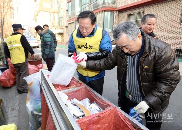 지난 17일 차성수 서울 금천구청장은 재활용정거장 제도를 운영하고 있는 독산4동을 방문해 주민들이 올바르게 재활용품을 배출할 수 있도록 도왔다. 사진은 차 구청장(가운데)이 배출 재활용품을 정리하는 모습.(사진제공=금천구청)