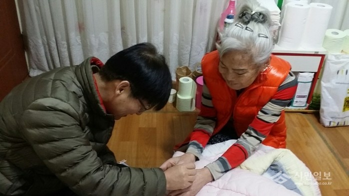 경기 동두천시 중앙동 주민센터와 경희이담한의원 김진성 원장은 지난 16일 중앙동 거주 홀몸노인 3가구를 방문해 노인들의 건강과 안부를 살피는 '침술 봉사활동'을 실시했다. 사진은 김 원장이 노인에게 침을 놓는 모습.(사진제공=동두천시청)