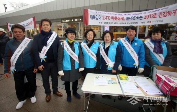 지난 18일 서울 강남구 코엑스에서 내복을 입고 실내온도를 줄이는 ‘동절기 온(溫)맵시 캠페인’이 열렸다. 사진은 캠페인에 참석한 신연희 구청장(가운데)이 캠페인 관계자들과 함께 기념촬영하는 모습.(사진제공=강남구청)