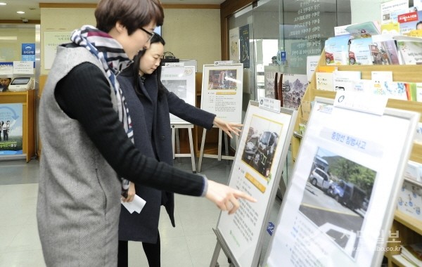 서울 광진구는 오는 31일까지 2주 동안 구청 교통행정과 민원실에서 주민들을 대상으로 '교통사고 사례 현장사진' 전시회를 개최한다. 사진은 지난 18일 주민들이 교통사고 현장사진을 보고 있는 모습.(사진제공=광진구청)