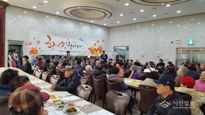 지난 18일 인천 남동구 논현고잔동은 지역 소재교회인 드림교회와 함께 지난 18일 노인 150명을 점심식사에 초청해 '새해맞이 떡국행사'를 개최했다. 사진은 관계자가 노인들에게 인사말을 하는 모습.(사진제공=남동구청)