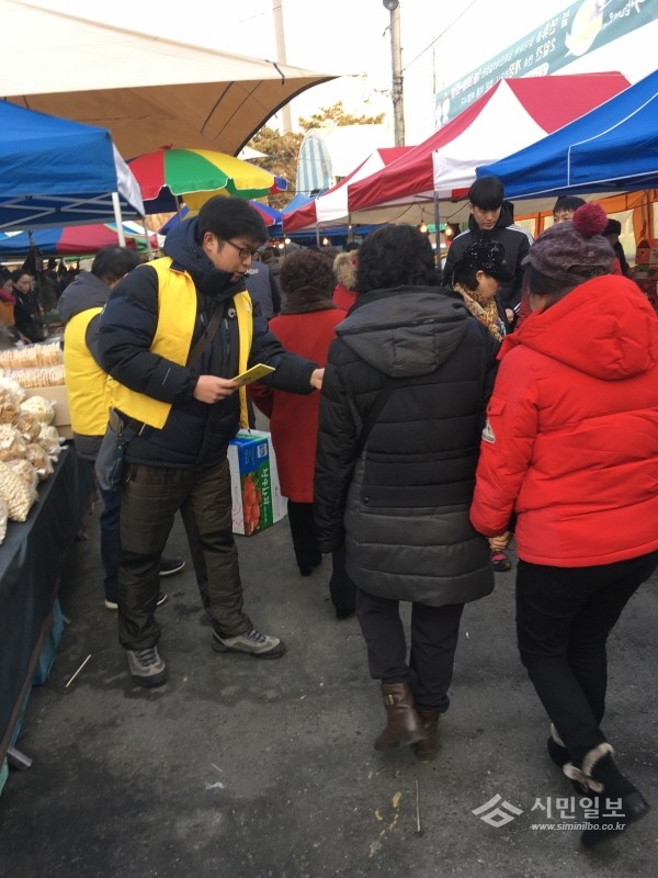 경기 김포시가 지난 17일 설 명절을 맞아 시민이 많이 찾는 김포5일장에서 시 도로명주소 서포터즈 토지정보과 직원들과 함께 ‘설맞이 도로명주소 홍보 캠페인’을 펼쳤다.(사진제공=김포시청)