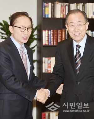 반기문 전 유엔 사무총장(오른쪽)이 19일 오후 서울 강남구 이명박 전 대통령 사무실을 방문, 이 전 대통령과 인사를 하고 있다.