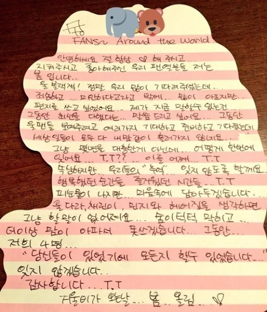 마지막으로 그는 “그동안 저희 4명 당신들이 있었기에 뭐든지 할 수 있었습니다. 잊지 않겠습니다. 감사합니다”라며 고마운 마음을 드러냈다.
