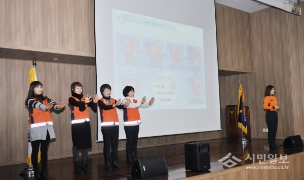 서울 구로소방서는 19일 오후 소방서 3층 강당에서 의용소방대원 전원이 참석한 가운데 신년인사회와 함께 첫 정기교육을 실시했다. 사진은 이번 서울소방재난본부 전문의용소방대 강사가 기본응급처치 시범을 선보이는 모습.(사진제공=구로소방서)