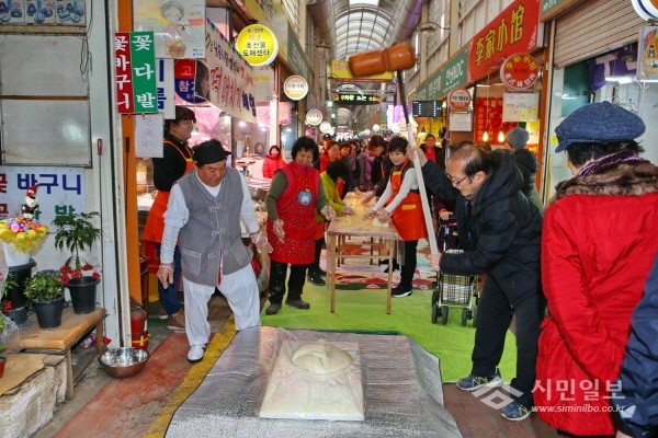 지난 18일 서울 금천구 남문시장에서 설을 맞아 전통시장 설명절 이벤트가 열렸다. 사진은 남문시장 상인회 관계자들이 시장을 찾은 고객들을 위해 떡메치기 행사를 진행하는 모습.(사진제공=금천구청)