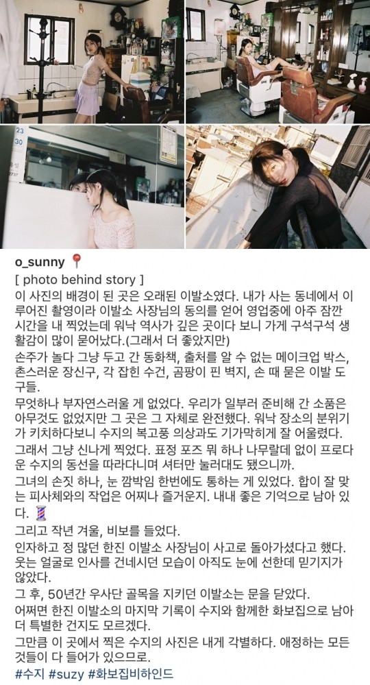 수지의 화보 촬영을 맡은 오선혜 작가는 최근 자신의 인스타그램에 “이 사진의 배경이 된 곳은 오래된 이발소였다. 내가 사는 동네에서 이루어진 촬영이라 이발소 사장님의 동의를 얻어 영업중에 아주 잠깐 시간을 내 찍었는데 워낙 역사가 깊은 곳이다 보니 가게 구석구석 생활감이 많이 묻어났다”며 글을 게재했다.