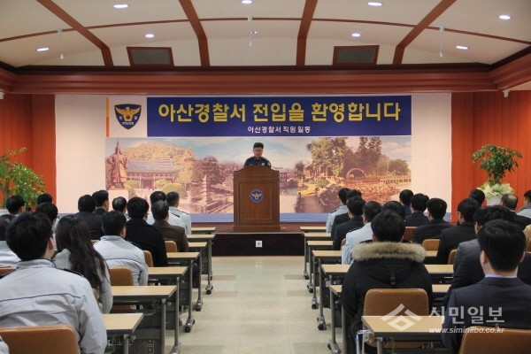 충남 아산경찰서는 23일 대회의실에서 경무과 최근범 경위 등 118명에 대해 인사 발령 신고식을 개최했다. 사진은 신고식에 참여한 김종민 서장이 직원들에게 격려사를 전하는 모습.(사진제공=아산경찰서)