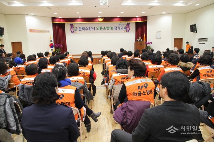 서울 관악소방서는 지난 19일 오후 3층 가람홀에서 의용소방대(남녀) 대장 등 의용소방대원 140여명이 참석한 가운데 신년 첫 의용소방대 정기교육을 실시했다. 사진은 황인환 서장이 인사말을 하는 모습.(사진제공=관악소방서)