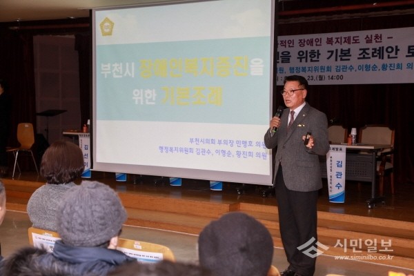| ▲ 부천시청에서 열린 토론회에서 부천시의회 김관수 의원이 '장애인복지증진 기본 조례안'에 대해 설명하고 있다. | ||