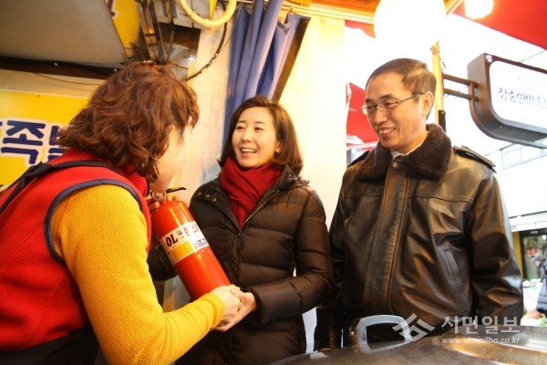 서울 동작소방서는 지난 21일 오전 11시 나경원 국회의원, 구의원 등과 함께 사당동 남성사계시장을 방문해 화재예방을 위한 현장점검에 나섰다. 사진은 나 의원(가운데)과 박찬호 서장이 상인에게 소화기를 전달하는 모습.(사진제공=동작소방서)