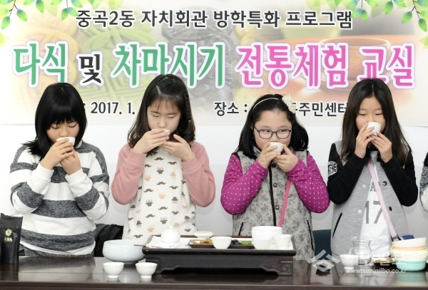 광진구 중곡2동주민센터에서 지난 23일 오전 10시~낮 12시 '다식 및 차 마시기 전통체험교실'이 열렸다. 사진은 이번 프로그램에 참여한 어린이들이 전통 차를 마시는 모습.(사진제공=광진구청)