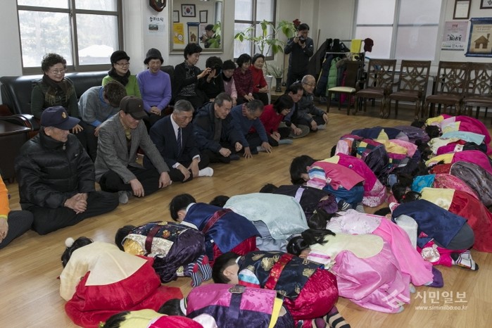 지난 23일 새해를 맞아 서울 송파구 잠실동 부리도어린이집 아동 30여명이 잠실동 엘스아파트 경로당을 방문해 '설맞이 합동 세배'를 했다. 사진은 한복을 곱게 차려 입은 아이들이 노인들에게 세배를 하고 있는 모습.(사진제공=송파구청)