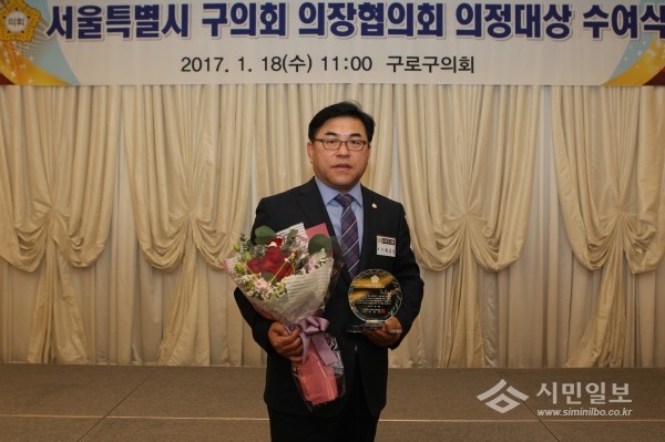 최근 제갑섭 서울 강동구의원은 베스트 웨스트 구로호텔에서 개최된 서울시 구의회 의장협의회 1월 월례회의에서 의정대상을 수상했다. 사진은 제 의원이 의정대상 수상 후 기념사진 촬영을 하는 모습.(사진제공=강동구의회)