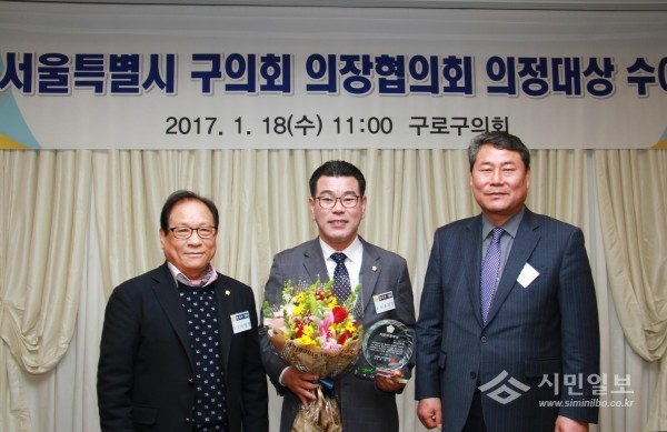 최근 조기만 서울 강서구의원은 베스트 웨스트 구로호텔에서 개최된 서울시 구의회 의장협의회 1월 월례회의에서 의정대상을 수상했다. 사진은 조 의원(가운데)과 동료 의원들이 의정대상 수상 후 기념사진 촬영을 하는 모습.(사진제공=강서구의회)