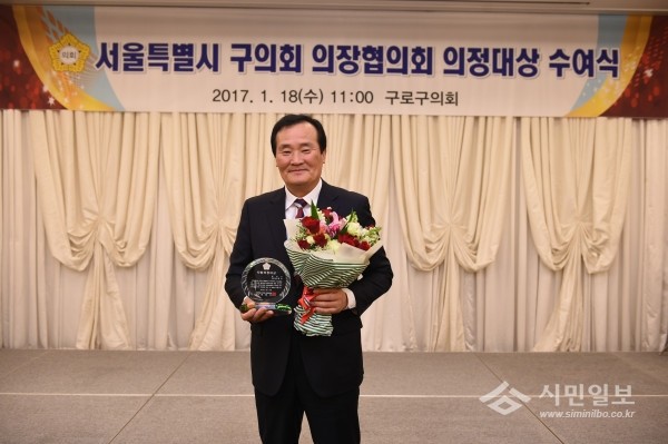 최근 심광식 서울 양천구의원은 베스트 웨스트 구로호텔에서 개최된 서울시 구의회 의장협의회 1월 월례회의에서 의정대상을 수상했다. 사진은 심 의원이 의정대상 수상 후 기념사진 촬영을 하는 모습.(사진제공=양천구의회)