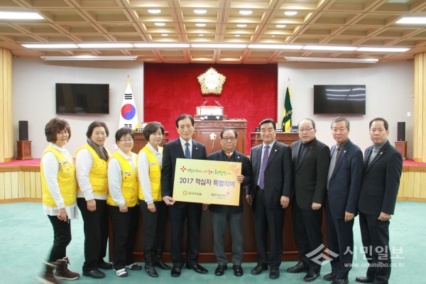 25일 구의회에 따르면 이날 이영철 의장, 탁수명 부의장, 장상기 운영위원장, 이의걸 행정재무위원장, 김용원 복지건설위원장은 구의회를 방문한 대한적십자봉사회 강서지구협의회 회원들에게 ‘2017년도 적십자 특별회비’를 전달하며 적십자회원들의 노고에 감사와 격려의 뜻을 전했다.
