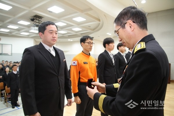 지난 23일 서울 동작소방서는 심정지 환자를 심폐소생술로 소생시켜 소중한 생명을 구한 119구급대원 김희태 등 6명에게 하트세이버 인증서 및 배지를 수여했다. 사진은 박찬호 서장이 대원들에게 배지를 수여하는 모습.(사진제공=동작소방서)