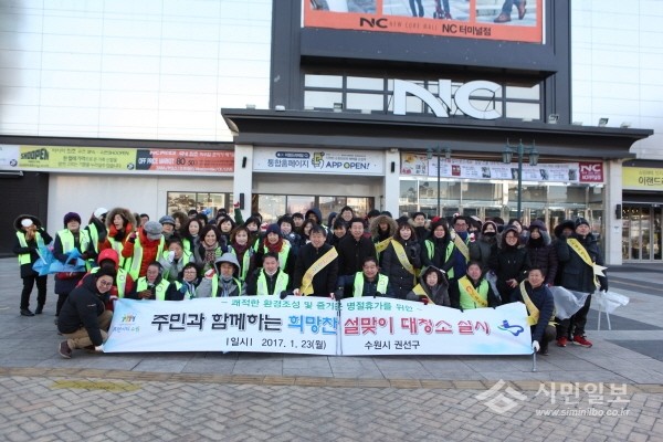 지난 23일 경기 수원시 권선구는 서수원 버스터미널 주변에서 터미널 및 이마트 관계자 등 주민 100여명이 참석한 가운데 설맞이 일제 대청소를 실시했다. 사진은 참여자들이 기념촬영을 하는 모습.(사진제공=권선구청)