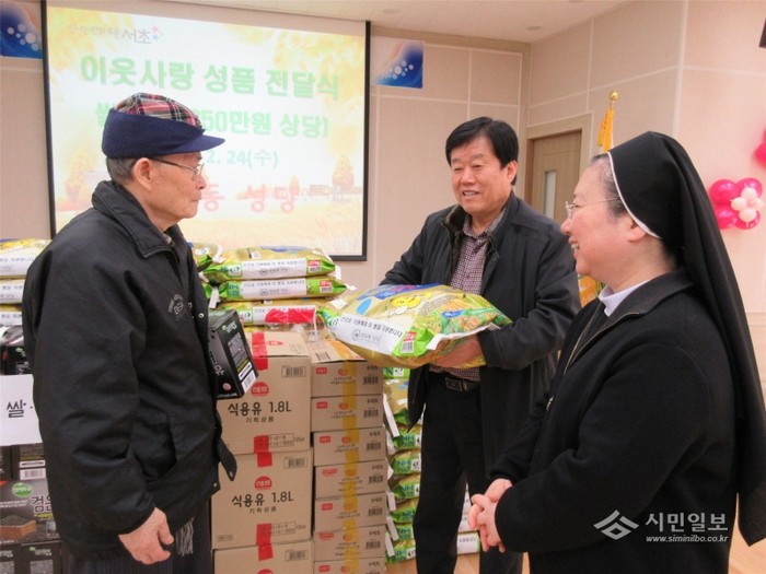 서울 강남구 잠원동은 25일 잠원성당으로부터 지역내 홀몸노인 등의 저소득주민을 위한 약 540만원 상당의 성품을 후원받아 지역주민에게 전달했다. 사진은 성당 관계자가 성품을 지역주민에게 전달하고 있는 모습.(사진제공=강남구청)