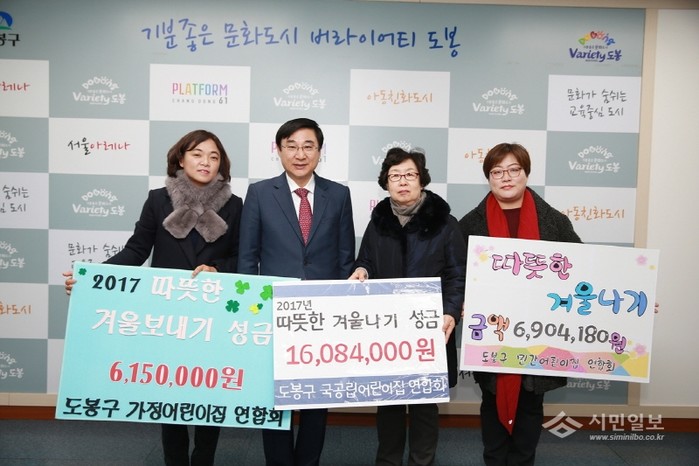 최근 서울 도봉구는 도봉구어린이집연합회로부터 지역내 260곳의 어린이집에서 모은 2913만8000원의 성금을 기탁받았다. 사진은 이동진 구청장(왼쪽에서 두 번째)과 관계자들이 기탁식 후 기념촬영을 하는 모습.(사진제공=도봉구청)