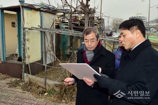 | ▲ 도태호 제2부시장(오른쪽)이 영화동 벌집촌 재난취약지역을 찾아가 현장행정을 펼치고 있다. | ||