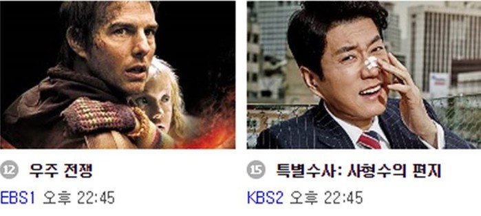 오후 22:45분에는 EBS1 우주전쟁이 오후 22:45분에는 KBS2를 통해 특별수사:사형수의 편지가 방영된다.