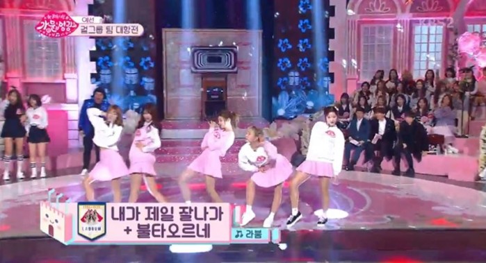 이날 예선전에서 걸그룹들은 팀 대항전을 펼쳤고 뮤직뱅크의 엠씨를 보고 있는 솔빈이 리더로 활동하고 있는 걸그룹 '라붐'과 '여자친구'가 맞붙게 됐다.