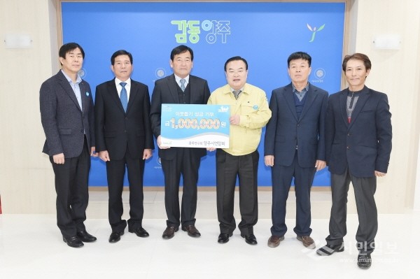 경기 양주시농업기술센터 농업인학습단체 품목별연구회와 생활개선회는 지난 26일 불우이웃을 위해 200만원 상당의 성금과 물품을 시에 전달했다. 사진은 이성호 시장(오른쪽 세 번째) 및 관계자들이 기념촬영하는 모습.(사진제공=양주시청)