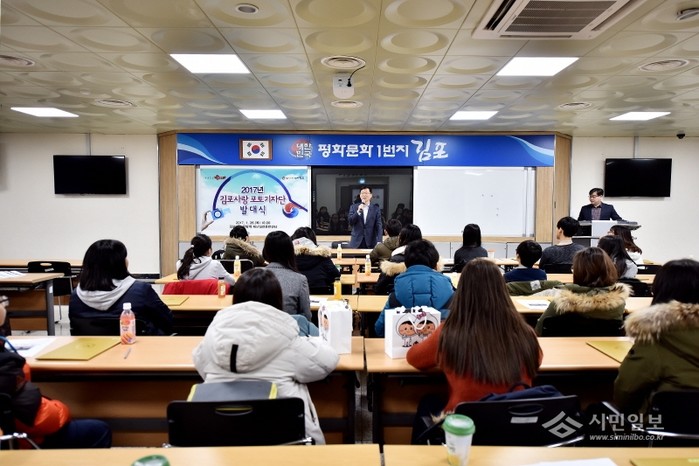 경기 김포시 김포사랑 포토기자단이 지난 26일 시청 민방위 재난훈련실전센터에서 발대식을 열고 본격적인 활동에 돌입했다. 사진은 유영록 시장이 포토기자단에게 인사말을 하는 모습.(사진제공=김포시청)