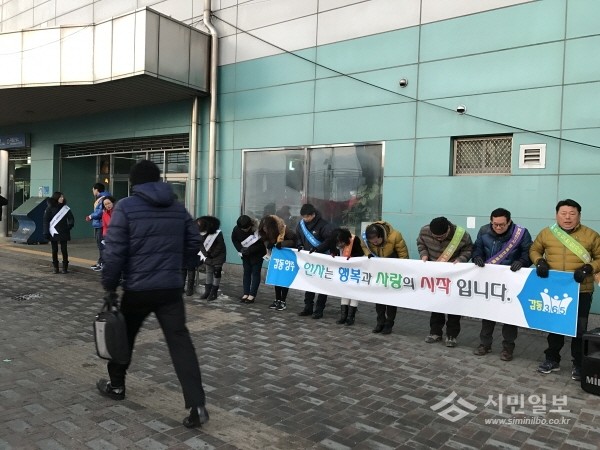 경기 양주시 양주1동 주민센터는 최근 '친절 양주시 만들기'의 일환으로 양주역에서 인사 잘하기 캠페인을 실시했다. 사진은 양주1동 감동365 소통감동분과 직원 및 분과위원 30여명이 캠페인을 펼치는 모습.(사진제공=양주시청)