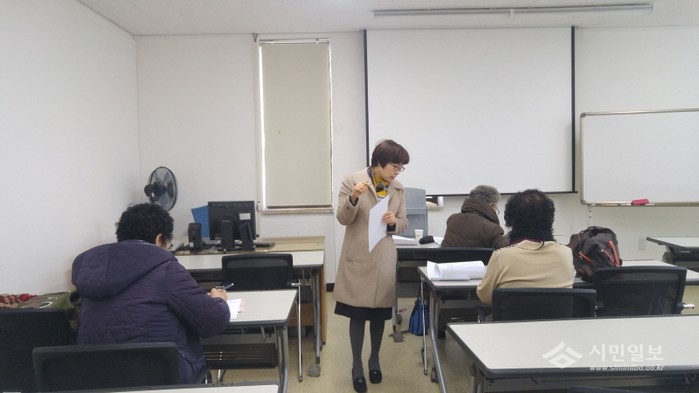 충남 아산도서관은 최근 초등학력인정 문자해득교육 프로그램 '2단계 직접진입진단평가'를 실시했다. 사진은 관계자가 노인들에게 시험 관련 사항에 대해 설명하는 모습.(사진제공=아산교육지원청)