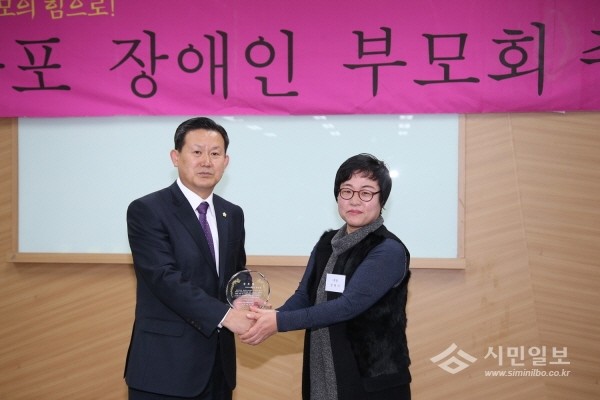 | ▲ 마포구의회 한일용 의장(왼쪽)이 최근 (사)함께가는 마포장애인부모회로부터 지역사회 복지 정책 발전을 위해 노력한 공로를 인정받아 공로패를 받았다. | ||