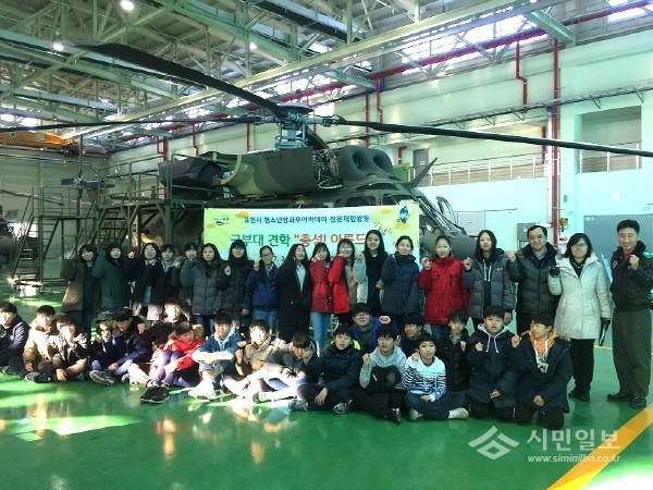 최근 경기 포천시 청소년교육문화센터 청소년방과후아카데미 수강생들이 육군 제15항공단 부대를 견학했다. 사진은 아카데미 수강생들이 대한민국 독자기술로 개발한 수리온 헬기 앞에서 기념촬영하는 모습.(사진제공=포천시청)