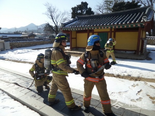 경기 하남소방서는 지난 1일 오후 하남시 춘궁동 소재 경기도 문화재자료 제13호인 광주향교를 대상으로 유관기관 합동소방훈련을 실시했다. 사진은 소방공무원들이 화재진압 훈련을 하는 모습.(사진제공=하남소방서)